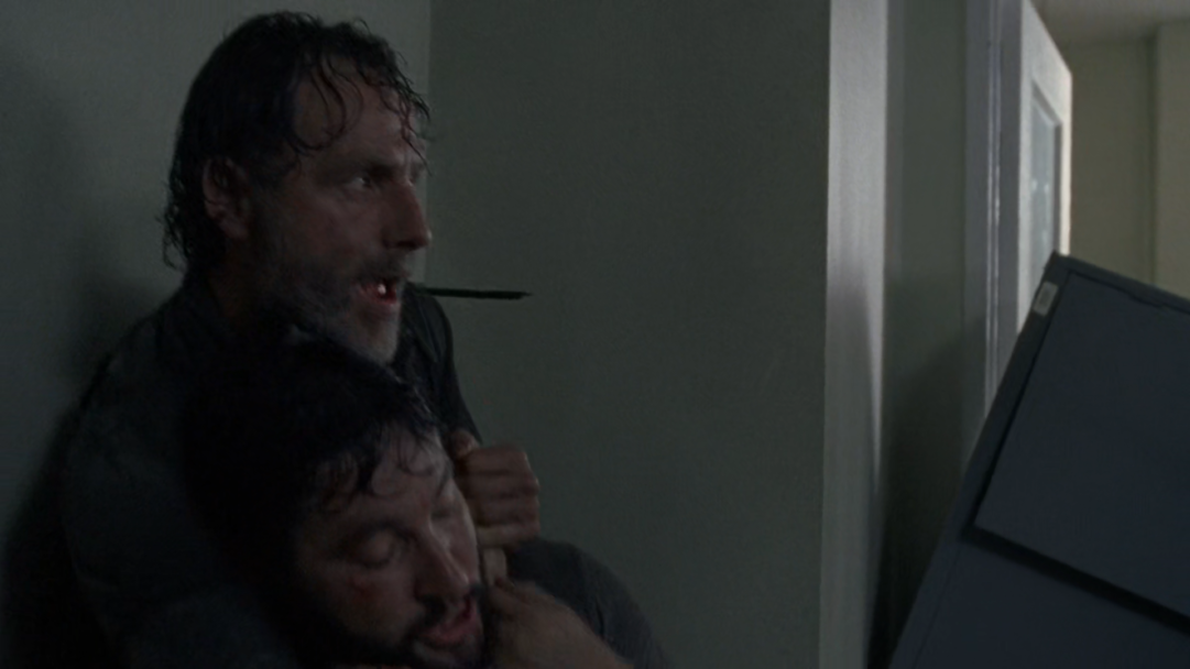 La misión de Rick no sale como querría tras tirarse medio capítulo buscando las dichosas armas sin encontrarlas. Él y Daryl se deciden a explorar el piso alto del edificio debido a que el plano de Dwight no les ha servido para nada. Mientras tanto, el combate abajo sigue cobrándose vidas con lo que deciden repartirse la faena separándose.
