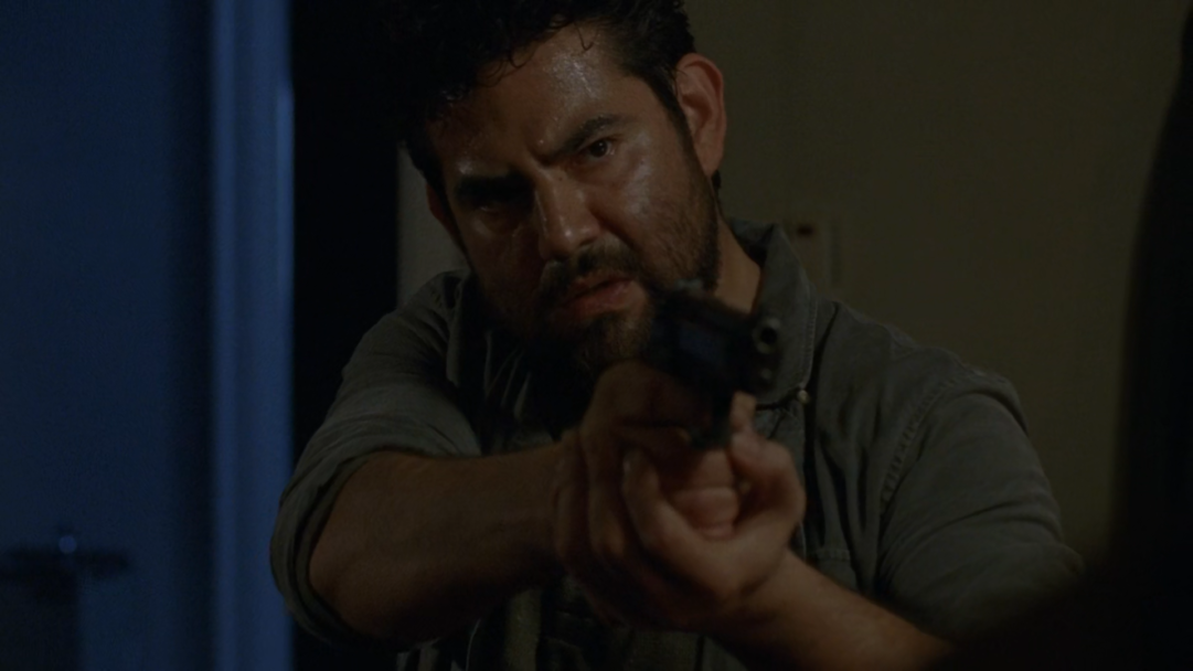 Llegando al «tan esperado» cliffhanger del episodio, Rick se encuentra de nuevo contra la espada (en este caso una pistola) y la pared al encontrarse con un viejo conocido que me extraña que él mismo se acuerde. Morales pasó desapercibido en la primera temporada, con una aparición de solo 6 episodios, como un padre de familia que toma un camino opuesto al de Rick en su búsqueda de unos parientes lejanos en Alabama. Bueno, pues el bueno de Morales ha vuelto y está con Los Salvadores.
