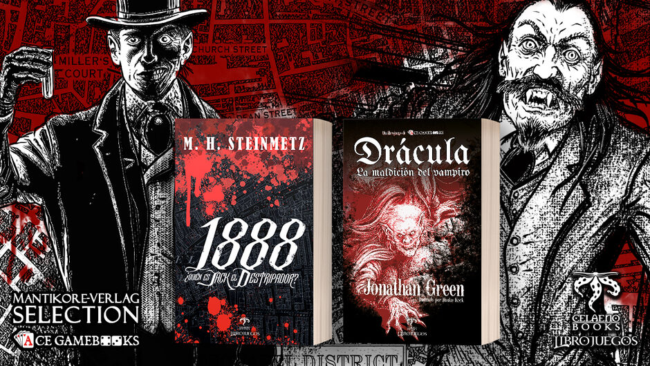 “Celaeno Books se complace en anunciar el lanzamiento de dos aclamados librojuegos que redefinen el género del horror interactivo: Drácula: La maldición del vampiro de Jonathan Green y 1888: Wer ist Jack the Ripper? de M.H. Steinmetz. Ambos títulos estarán disponibles a través de una campaña de financiación partir de la primera semana de mayo, y YA se puede realizar la preinscripción en https://vkm.is/dracula