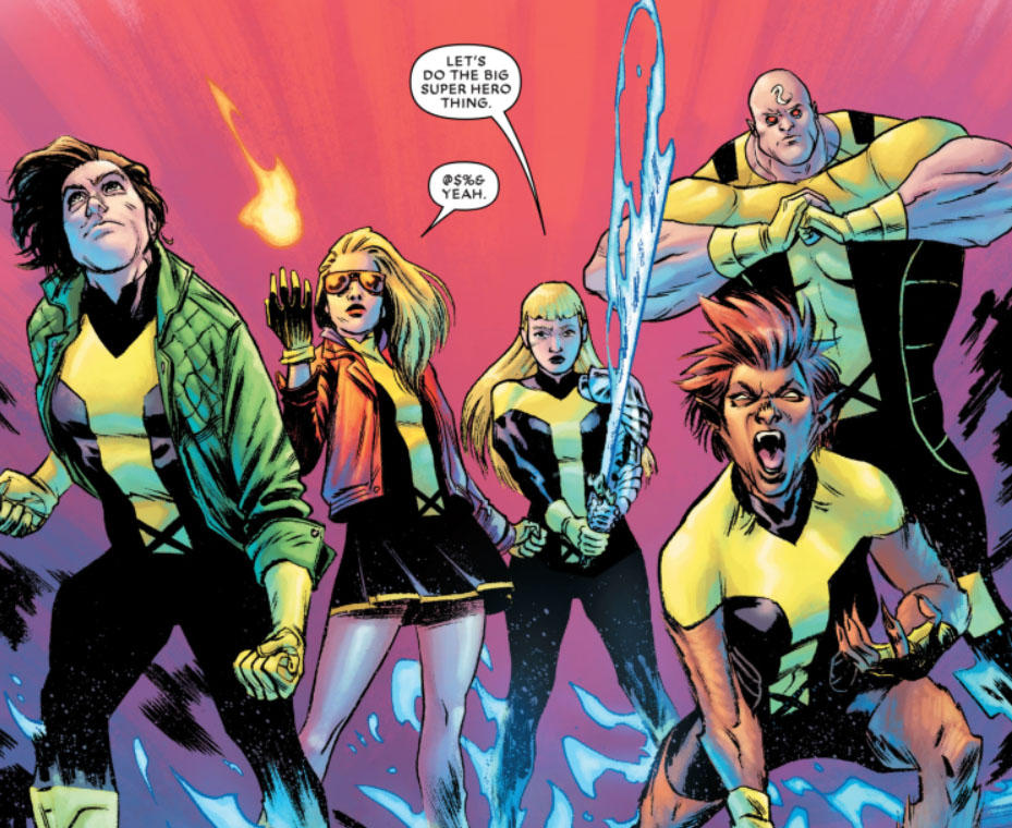 Todos sabemos que los Nuevos Mutantes no son tan nuevos como el título nos pueda sugerir. Los Nuevos Mutantes ya han estado rondando desde allá por el 82. Muchos grupos han sido los Nuevos Mutantes, pero quizás estos sean los más disfuncionales de la historia. Tenemos a la líder, Magik, Illyana Rasputin, una mutante teleportadora, gótica, bruja y demoníaca reina ocasional del limbo, con enormes problemas sociales y una gran incapaz de liderazgo y comunicación. A Rictor (Julio Ritchter), un capullo graciosete que provoca terremotos y pasa de la vida, como concepto. También está Loba Venenosa, una licántropa escocesa, que actúa como guía moral, con la brújula moral un pelín desviada. Fortachón… creo que sobran las palabras, es fuerte y una vez perdió el alma, aunque luego la recuperó. Y por último, a Bum Bum, que hace explotar cosas y actúa como capulla graciosita cuando Rictor está ocupado.